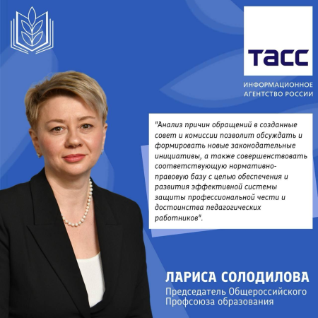 ⚡️ Читайте в большой статье на ТАСС комментарии председателя Общероссийского Профсоюза образования Ларисы Солодилова о работе недавно созданного Министерством просвещения Совета по защите чести и достоинства педагогов